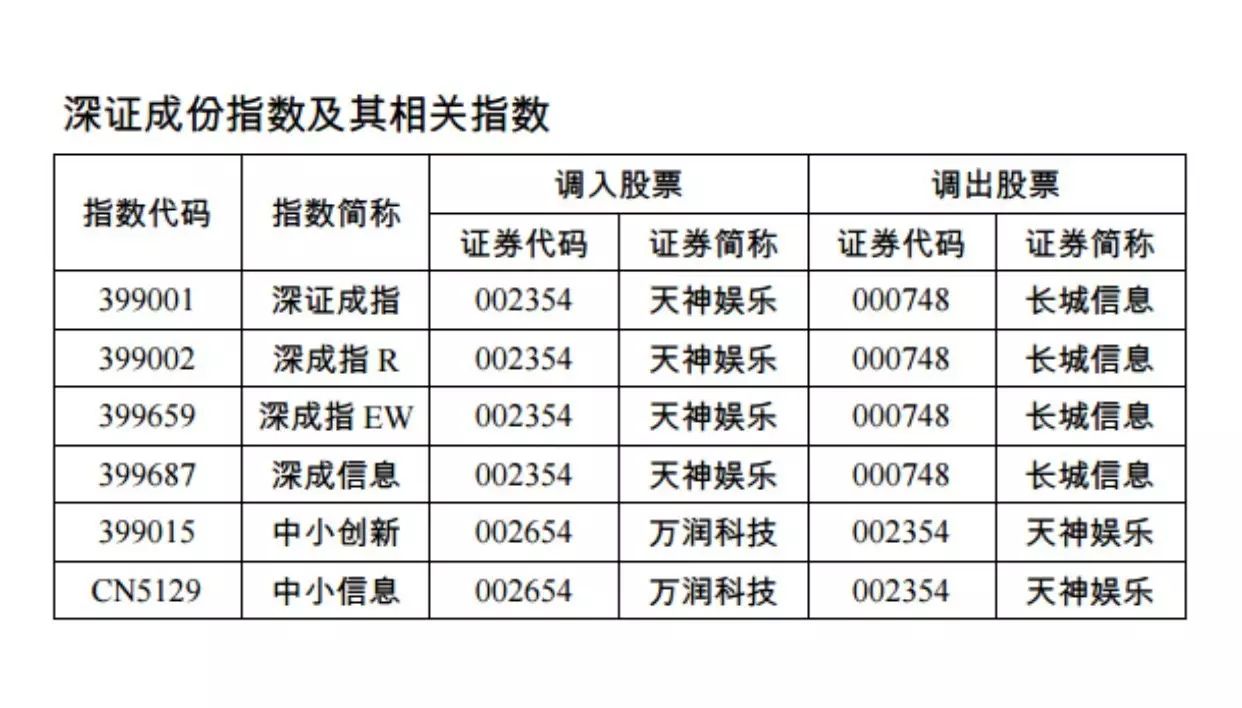 根據(jù)深圳證券交易所1月13日發(fā)布的《 關(guān)于調(diào)整深證成指等指數(shù)樣本股的公告》顯示,深交所決定于1月18日對深證成指、深證300等指數(shù)樣本股進(jìn)行調(diào)整,其中將天神娛樂(002354)調(diào)入深證