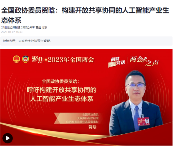 新華社客戶(hù)端 | 全國(guó)兩會(huì)專(zhuān)題報(bào)道全國(guó)兩會(huì)已經(jīng)召開(kāi),第十四屆全國(guó)政協(xié)委員,天娛數(shù)科董事、副總經(jīng)理賀晗,針對(duì)我國(guó)人工智能產(chǎn)業(yè)生態(tài)體系的三大短板,提出要加快推動(dòng)數(shù)據(jù)要素高效流