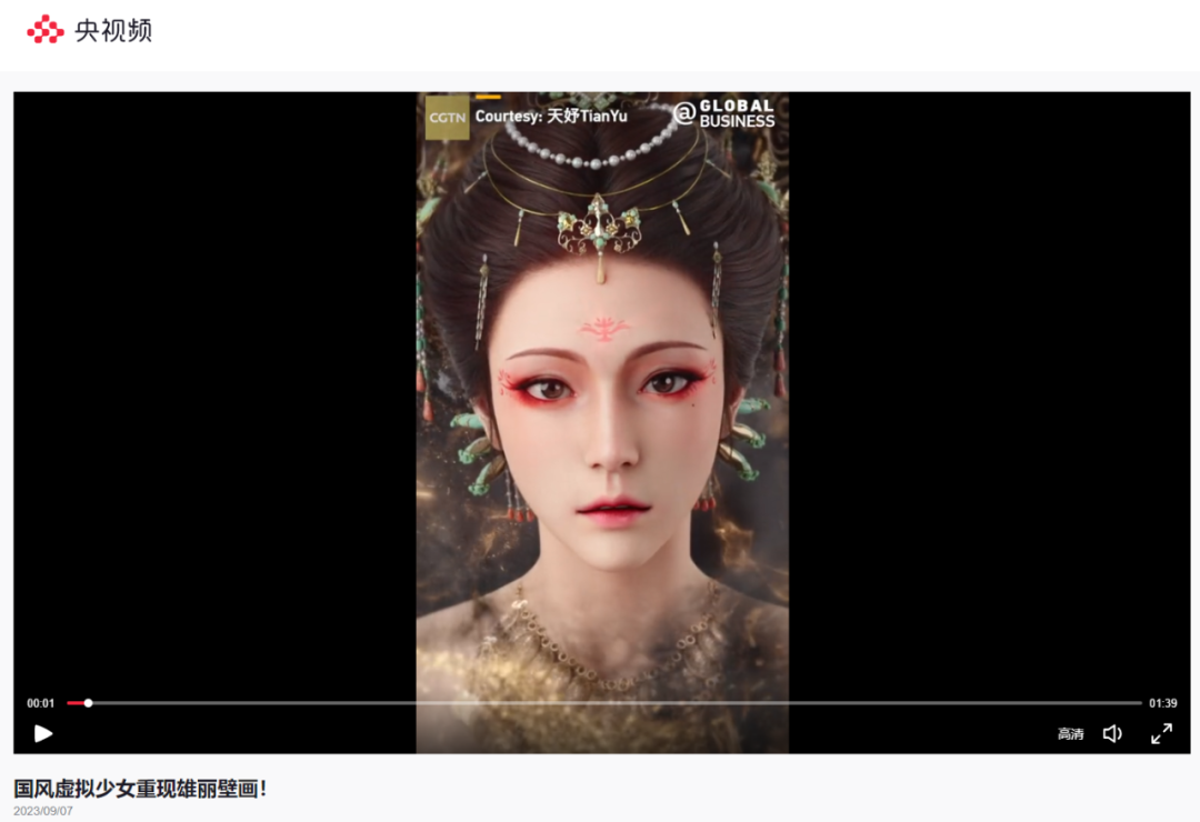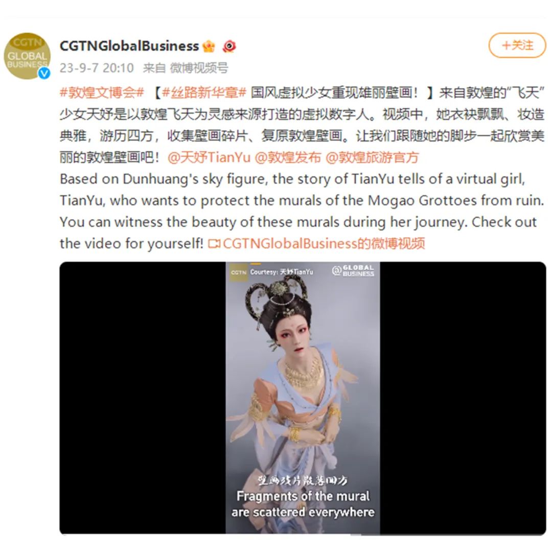 第六屆敦煌文博會(huì)期間,中國(guó)國(guó)際電視臺(tái)(CGTN)對(duì)天娛數(shù)科子公司元圓科技旗下虛擬數(shù)字人天妤進(jìn)行了連續(xù)三天的視頻推薦,在其Facebook,Twitter,YouTube、微博等多個(gè)官方賬號(hào)以及央視頻同步發(fā)布,助力天妤在海內(nèi)外的破圈,持續(xù)弘揚(yáng)中國(guó)傳統(tǒng)文化。