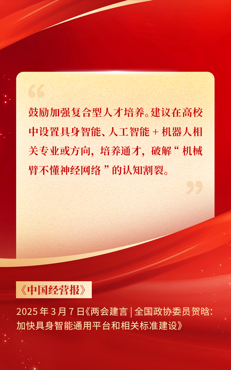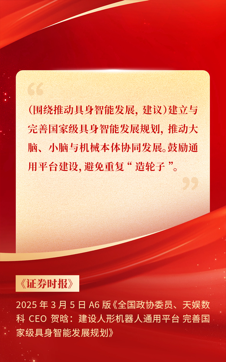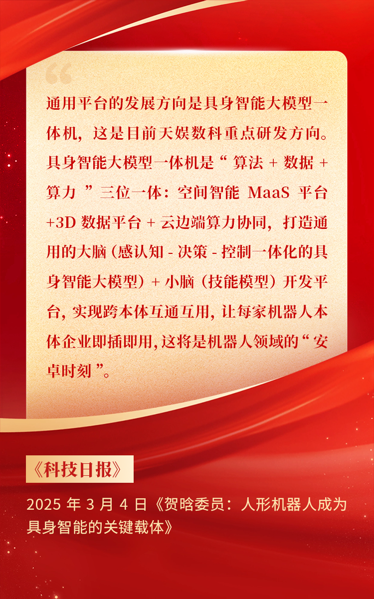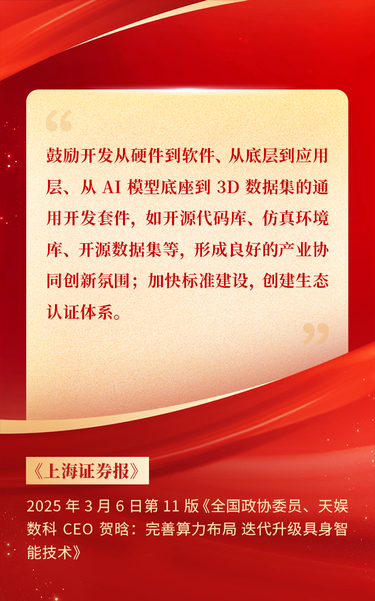 全國(guó)政協(xié)委員、天娛數(shù)科CEO賀晗連續(xù)第三年上會(huì)履職,圍繞“具身智能”“人形機(jī)器人”“人工智能產(chǎn)業(yè)”等熱詞積極建言,受到了媒體的廣泛關(guān)注,吸引了來(lái)自央視網(wǎng)、經(jīng)濟(jì)參考報(bào)、中國(guó)電子報(bào)、第一財(cái)經(jīng)日?qǐng)?bào)等央黨媒體、主流財(cái)經(jīng)等媒體記者的專訪報(bào)道,讓我們一起回顧賀晗委員兩會(huì)建言!